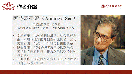 任静怡同学首先介绍了作者阿马蒂亚・森的背景。森是印度经济学家、哲学家,1998年诺贝尔经济学奖得主,被誉为“穷人的经济学家”,其学术贡献集中于福利经济学、社会选择理论等领域,尤其关注贫困、饥荒与自由的关系。