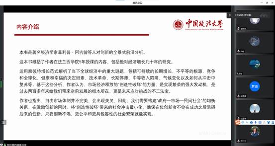 工商管理系、工商管理党支部研究生第29期读书研讨会于2022年11月10日晚以腾讯会议的方式顺利举行。本次读书会由张艾嘉同学主持,2020级企业管理硕士生罗佳敏和2021级企业管理硕士生刘家祺同学主讲。参与本次读书会的有我院工商管理系郭颖老师、王玲老师、马克态老师、葛爽老师、张亚琼老师、王尧老师、创新经济学特聘博导方竹兰老师以及2021级、2022级企业管理全体研究生,大家围绕党的二十大与葛爽老师推荐的《创造性破坏的力量》一书的内容展开了讨论。