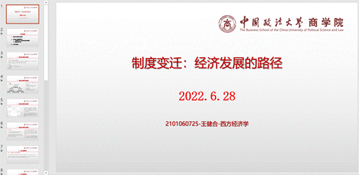 张群同学以对比旧制度学派同新制度经济学派的区别和联系为切入点,详细阐述了学者们对于“制度”定义的不同理解。接着从正式制度和非正式制度的视角出发,以金融监管中的上市制度改革为例,分析了影响制度变迁的因素。