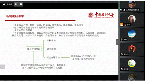周敏丹老师就技术变迁和制度变迁的关系同大家讨论。王禹婷同学认为,二者虽有区别但仍存在相同点,都是相对价格变化在起作用。毛庆庆同学认为,技术变迁和制度变迁是双向互动关系,并非严格的因果关系。周敏丹老师结合自己以往研究对技术变迁和制度变迁的关系进行了全面的总结。周老师指出,二者间的关系概括起来有三种不同观点:第一种是技术决定论,即技术变迁更加重要。第二种是制度变迁决定论,认为制度变迁决定技术变迁;第三种是协同演化论,认为制度变迁和技术变迁二者是紧密互动的,难以分清先后。司海平老师就我国“改革开放”这一政策同大家探讨经济制度的变迁问题。李丹认为,改革开放的动因在于经济制度变革存在帕累托改进,改革的收益比较高。