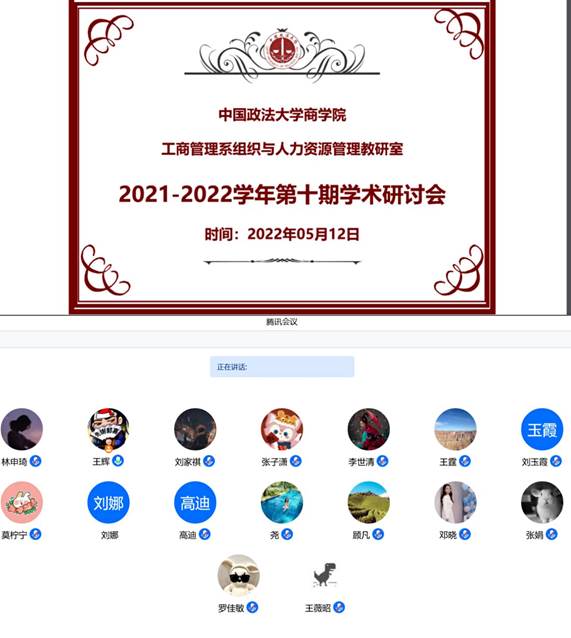 工商管理系组织与人力资源管理教研室于2022年5月12日14:00在腾讯会议线上召开第十期组织与人力资源管理学术研讨会,会议主题为“前沿论文导读与论文写作汇报”,由工商管理系王辉老师主持,李世清、张子潇两位同学进行论文写作汇报,罗佳敏同学进行前沿论文导读。组织与人力资源管理教研室王霆老师、顾凡老师、王尧老师、邓晓老师和学术研究生莫柠宁、王薇昭、林申琦、刘家祺出席。
