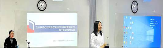 2020级西方经济学专业硕士研究生欧文潇汇报的论文是《企业家信心对货币政策信贷传导的影响研究——基于新冠疫情视角》。她从“新冠疫情对企业的影响研究”、“信心对货币政策的影响研究”、“经济不确定性对货币政策的影响研究”三方面进行文献梳理,并提出自己的研究假设,基于VAR模型进行实证研究。她的研究发现,在疫情防控期间,经济不确定性会降低货币政策信贷传导机制的有效性,其中企业家信心因素对货币政策的信贷传导具有一定的作用。