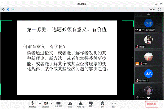 顺利通过论文答辩,是毕业的基础和前提。资本金融系高度重视首届金融专硕论文工作,为进一步提高论文写作质量,2020年7月22日上午,我系成功举行了2019级金融专硕在线论文指导讲座。本次讲座的主讲老师分别为胡继晔教授、李泳教授和李伯尧老师,系秘书李慧老师以及全体2019级金融专硕研究生在线聆听讲座,系主任程碧波副教授主持讲座。