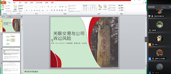 刘林同学的论文题目是《关联交易与公司诉讼风险》,主要从研究背景、研究问题、研究意义、理论分析、实证检验、结论等方面展开,着重讨论了关联交易行为与公司诉讼关系之间的潜在机制以及各个变量如何定义与测量。随后各位老师对于刘林同学的开题报告进行了评述:孟令星老师建议调整论证的逻辑顺序和对各个知识点进行一定的取舍,华忆昕老师给出诉讼风险案件指标等建议,许恒副教授主要对副标题选取以及关联交易的经济后果细化问题进行补充,刘志雄教授对影响机制和链条提出相关改进建议。