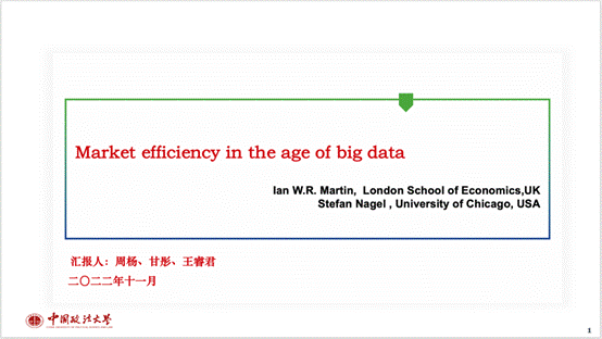 资本金融系2022年秋季学期第五期读书研讨会通过腾讯会议的方式成功举行,朱晓武老师、洪智武老师以及2022级金融专硕和学硕的同学参加了此次研讨会。本期读书会以朱晓武老师推荐的2022年发表于JFE上的论文《Market efficiency in the age of big data》为主要的研讨内容,2022级金融专硕周杨、甘彤、王睿君三位同学为本次读书会进行了主题报告,之后朱晓武老师和洪智武老师进行了点评。