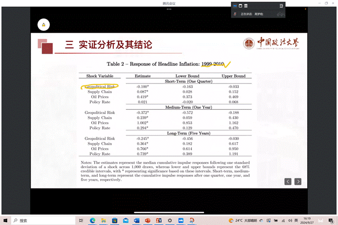 接着,高梦晗同学为大家介绍了文章变量指标的选取、构建模型和实证结果内容。文章采用SVAR模型,衡量了各个可能影响因素对于总体、核心、食物和能源四种通货膨胀指标的影响程度,并且运用独立的正态-Wishart先验贝叶斯的方法对模型进行检验。随后,高梦晗同学详细分析了实证结果,详细解读了地缘政治风险、全球供应链压力和国际油价对全球通货膨胀率的影响。在综合分析一副累计脉冲响应图、三张标准差冲击实证分析表、一张方差分解表后,文章作者得出的结论是全球供应链压力是整个样本期间(1999-2022)全球整体通胀波动的主要驱动因素。高梦晗同学在分享自己读文章的收获时,也提出了几点关于文章没有详细说明部分的疑惑,并希望老师进行解答。