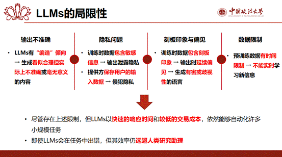 四名同学分享结束后,李伯尧老师说明了选取这篇文章的原因。一方面是生成式人工智能是当前极为热门的话题,特别是LLMs,在经济研究中有广泛的价值。另一方面是文章中介绍的功能,值得同学们在实践中运用。同时,老师提示同学们要全面看待LLMs,既要看到它的强大功能,又要注意其内在的局限性,LLMs的本质是重新汇集已有信息的过程,在内容上不具有人的创造力,仅能作为一个助手,帮助解决熟练型工作,不能替代我们的学习过程。