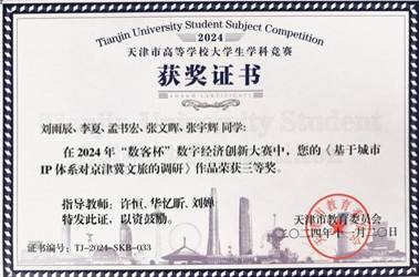 近日,由天津市教育委员会主办,天津财经大学承办的2024年“数客杯”数字经济创新大赛圆满落幕。由我院研究生刘雨辰、李夏、张文晖,民商经济法学院孟书宏,河北大学张宇辉五位同学组成的参赛团队,凭借作品《基于城市IP体系对京津冀文旅的调研》荣获大赛三等奖。