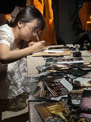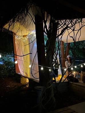 2023年6月23日晚,风铃长廊的尽头一改往日沉寂,繁灯铺缀,素缎缦立,一盏莹莹闪闪的橘灯烘透这方小亭。精致的明信片,梦幻的氛围灯,鲜艳的手捧花与气球翘首等待着毕业生的光临。